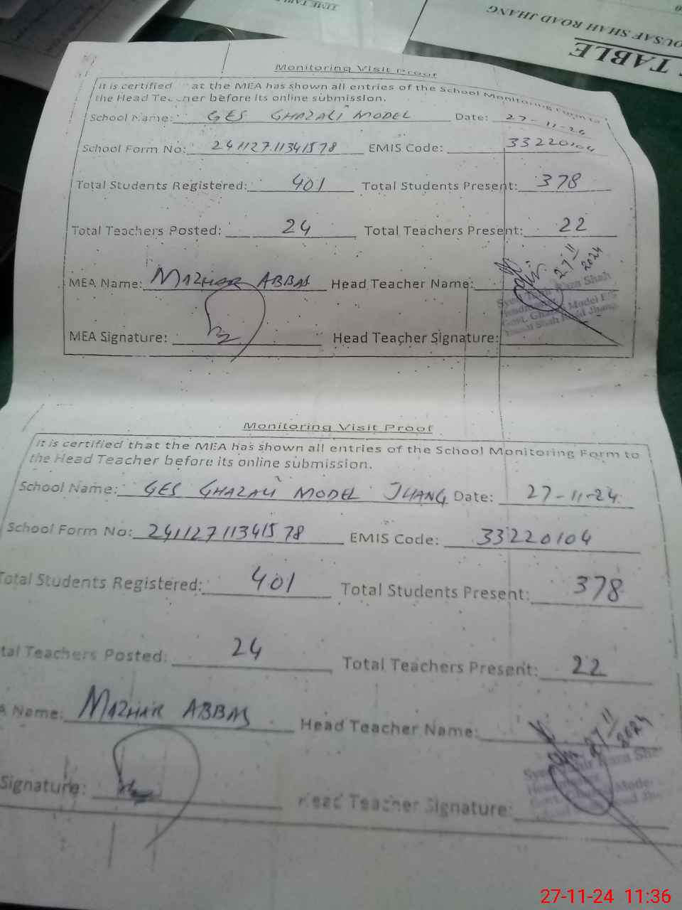 | Attendance Register | Head Teacher | MEA with School | Visit Proof |