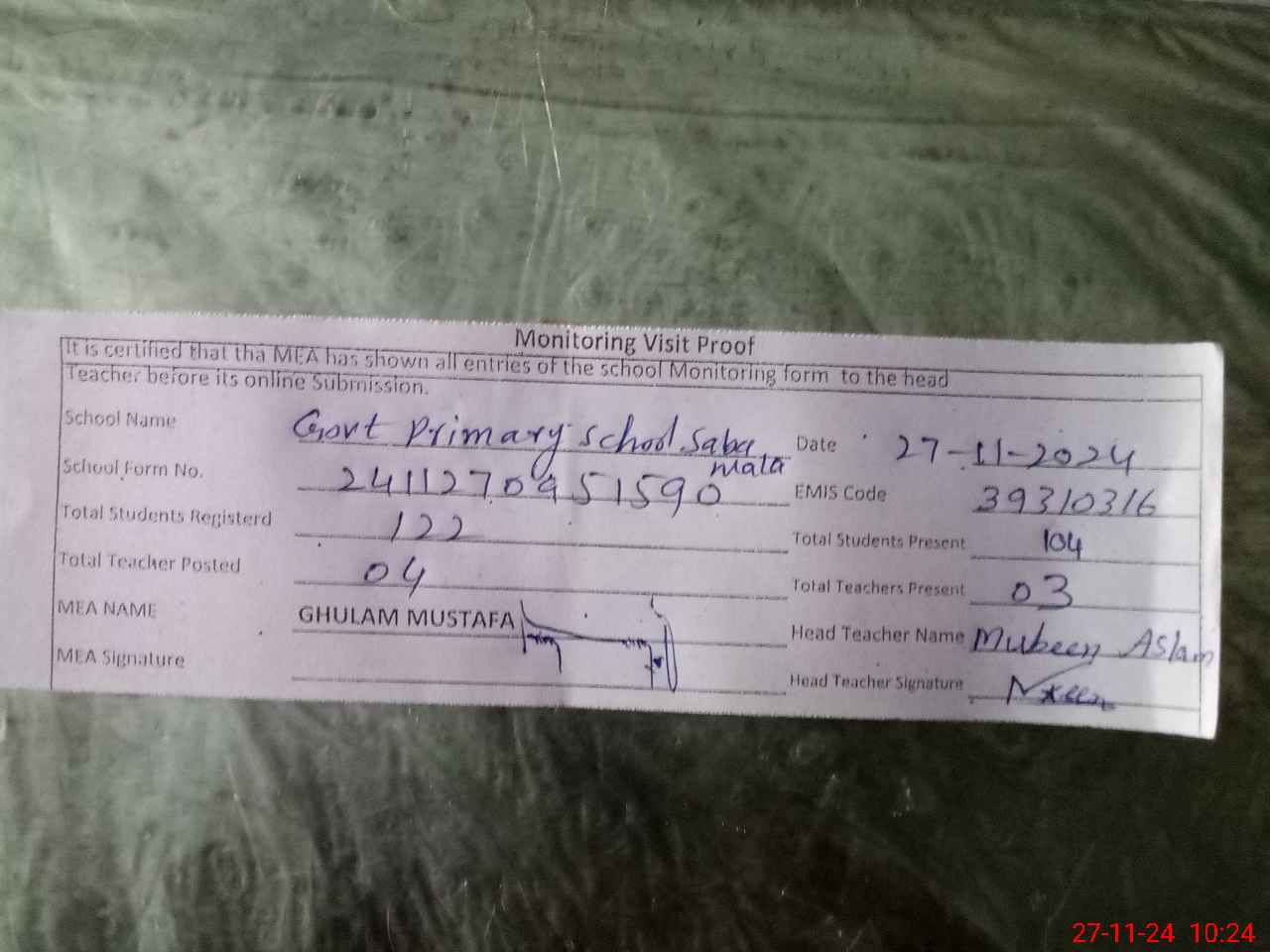 | Monitoring Date: 27-11-2024 | Start Time: 27-11-2024 09:51 AM | End Time: 27-11-2024 10:25 AM | Name of MEA: GH**** MU**** | |