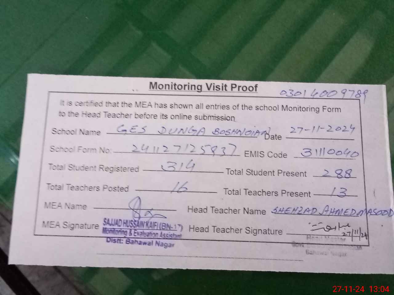 | Attendance Register | Head Teacher | MEA with School | Visit Proof |
