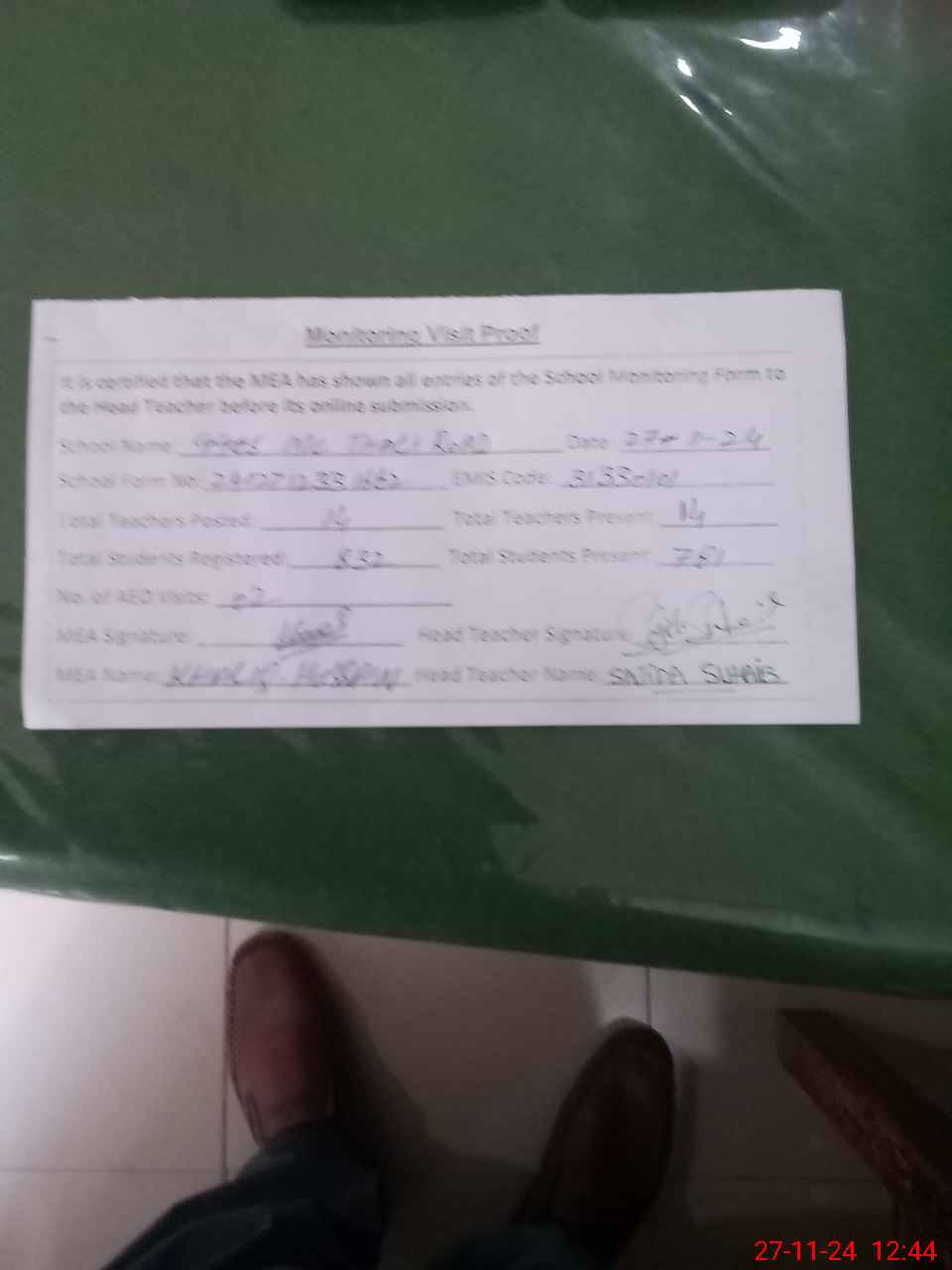 | Attendance Register | Head Teacher | MEA with School | Visit Proof |