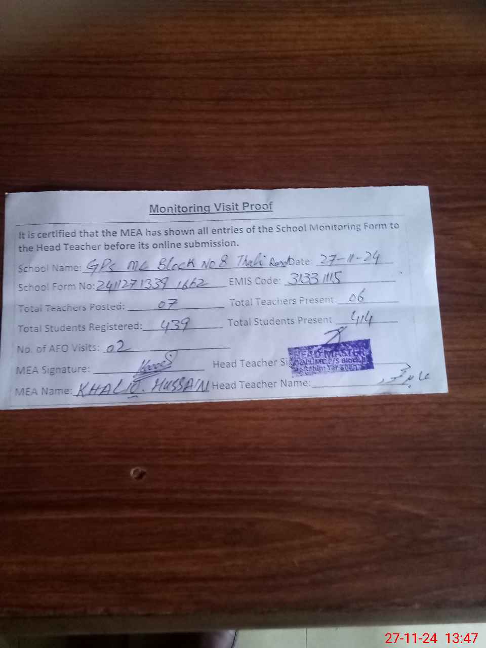 | EMIS Code: 31331115 | Name of School: GPS MC BLOCK NO. 8 THALI ROAD | |||
