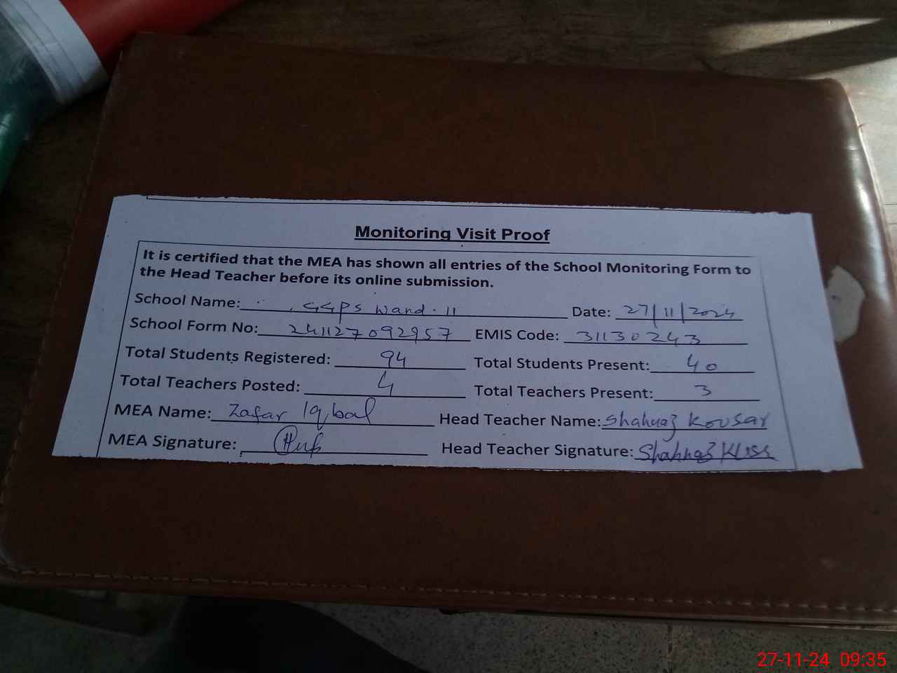 | Attendance Register | Head Teacher | MEA with School | Visit Proof |