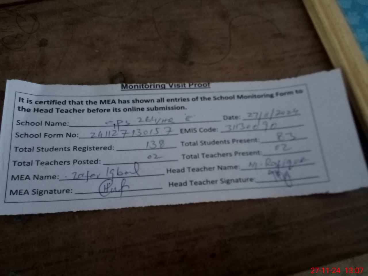 | Attendance Register | Head Teacher | MEA with School | Visit Proof |