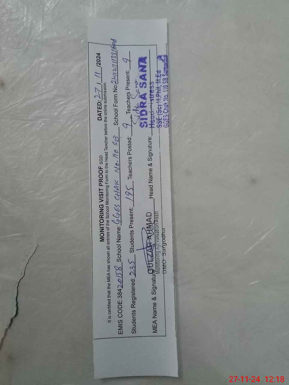 | Name: Si**** Sa**** Designation: (School Headmaster's/Headmistress's) SSE Sci Phone/Cell Number: 03**** |