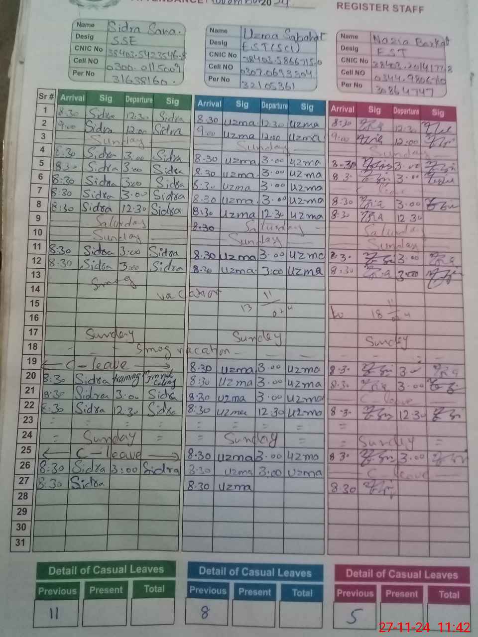 | CNIC | Full Name | Designation | R/C | Absence During Last Calender Month |
