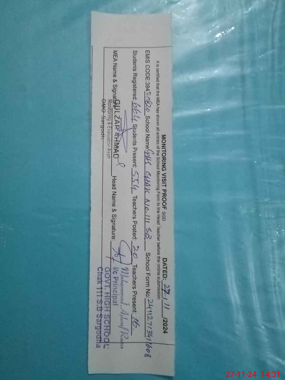 | EMIS Code: 38420820 | Name of School: GHS CHAK NO.111 SB | |||