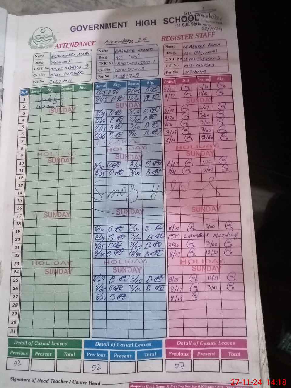 | CNIC | Full Name | Designation | R/C | Absence During Last Calender Month |