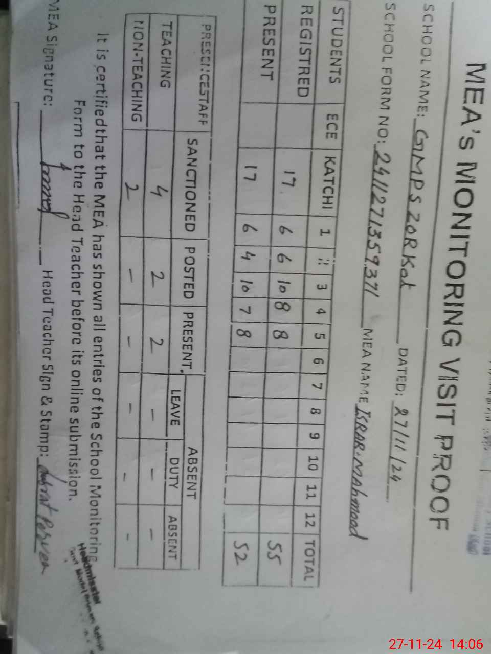 | Attendance Register | Head Teacher | MEA with School | Visit Proof |