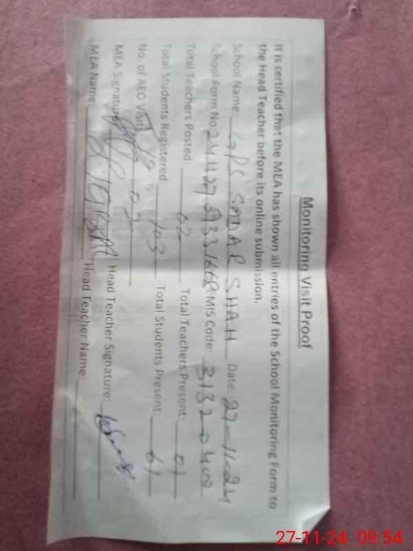 | EMIS Code: 31320400 | Name of School: GPS SADDAR SHAH | |||