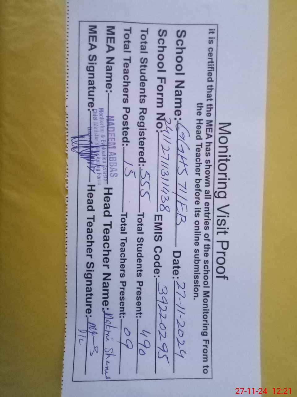 | Attendance Register | Head Teacher | MEA with School | Visit Proof |