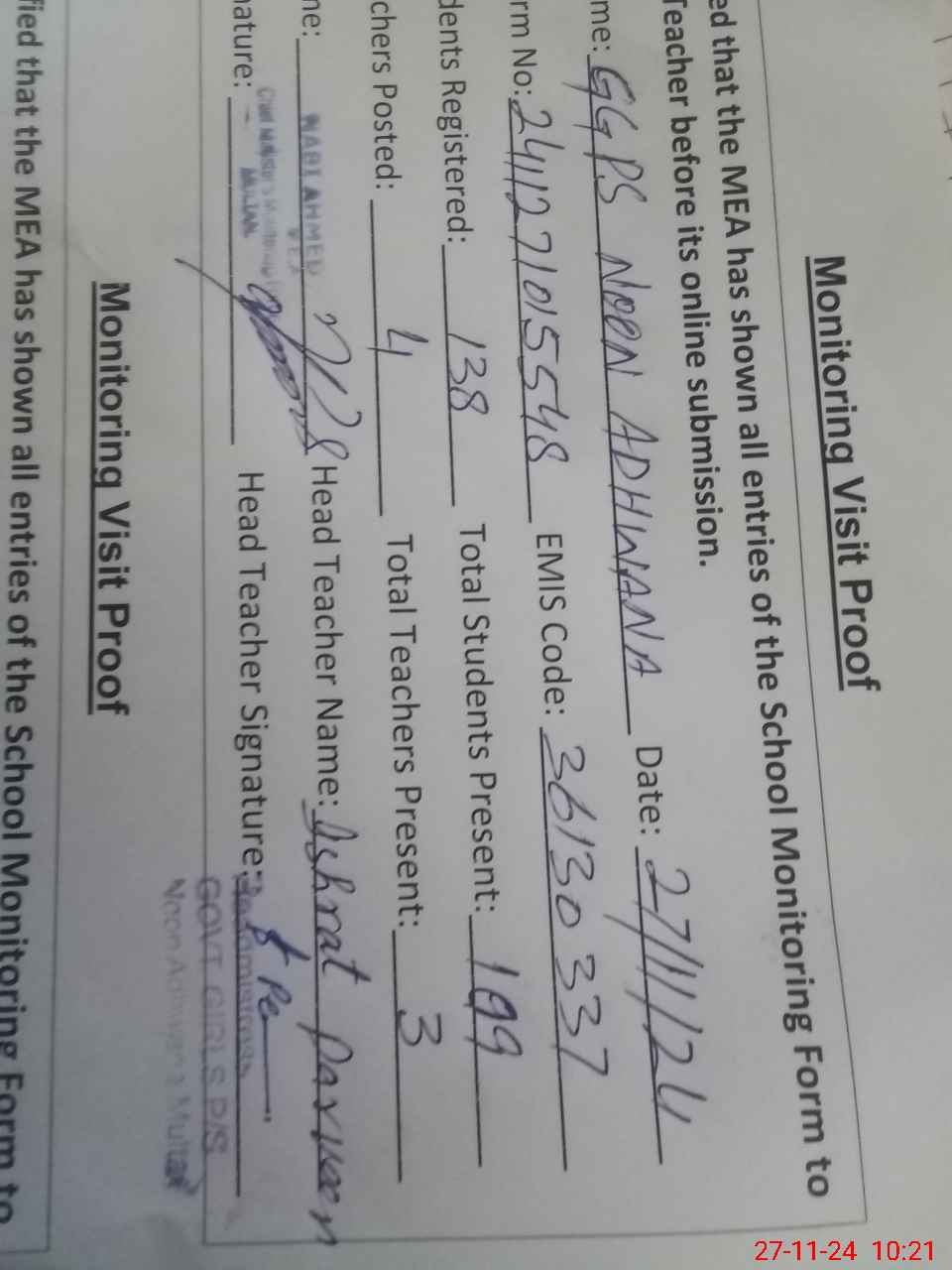 | Attendance Register | Head Teacher | MEA with School | Visit Proof |