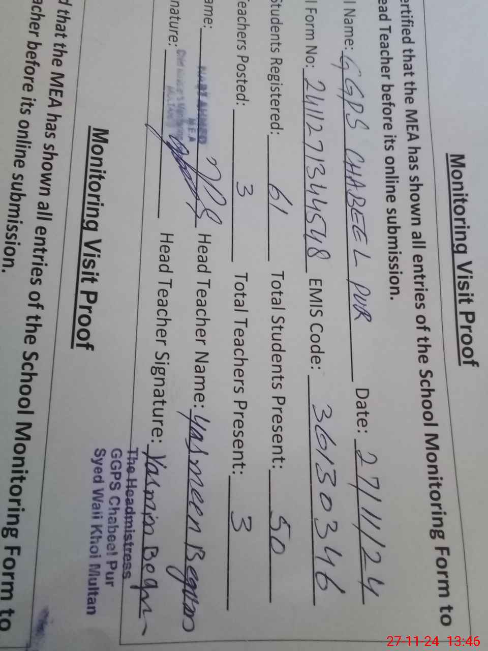 | EMIS Code: 36130346 | Name of School: GGPS CHABEEL PUR SYED WALI KHOI NAWAB PUR ROAD | |||