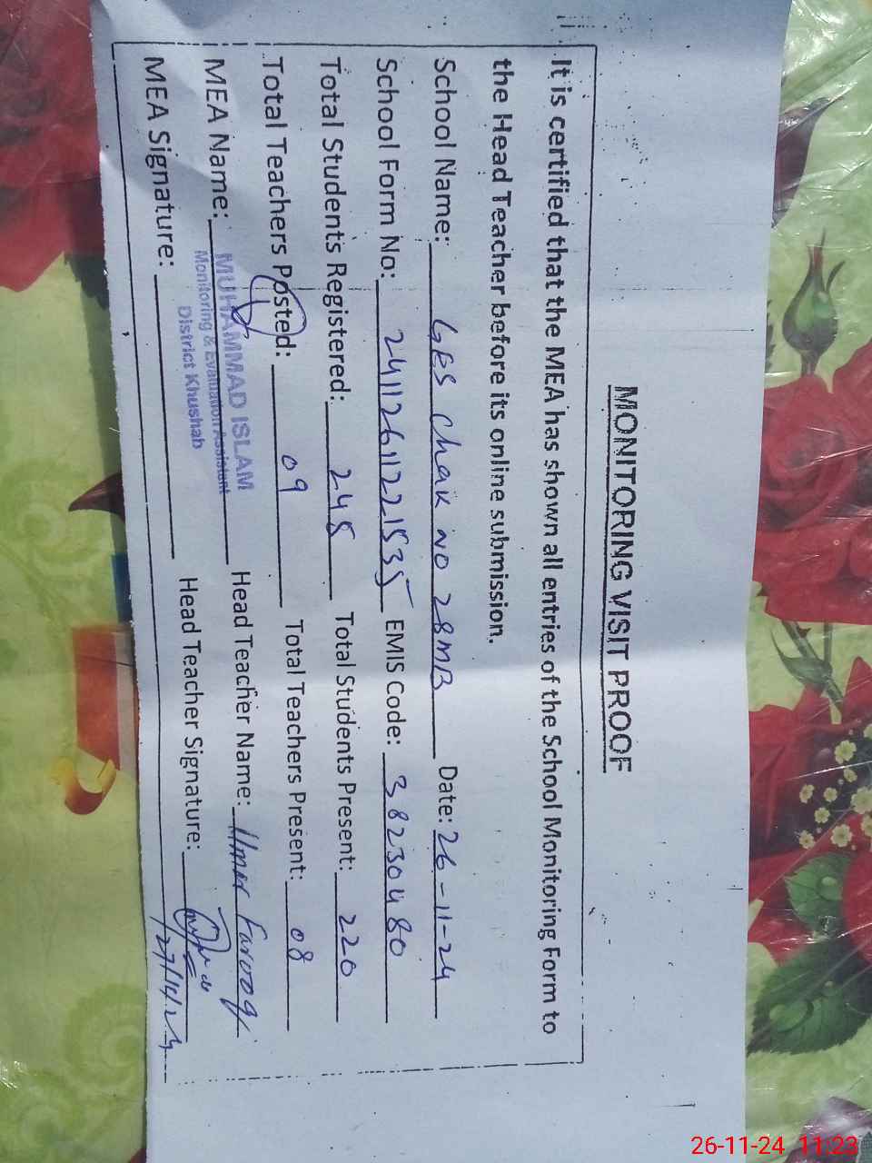| EMIS Code: 38230480 | Name of School: GES CHAK NO. 28 MB | |||