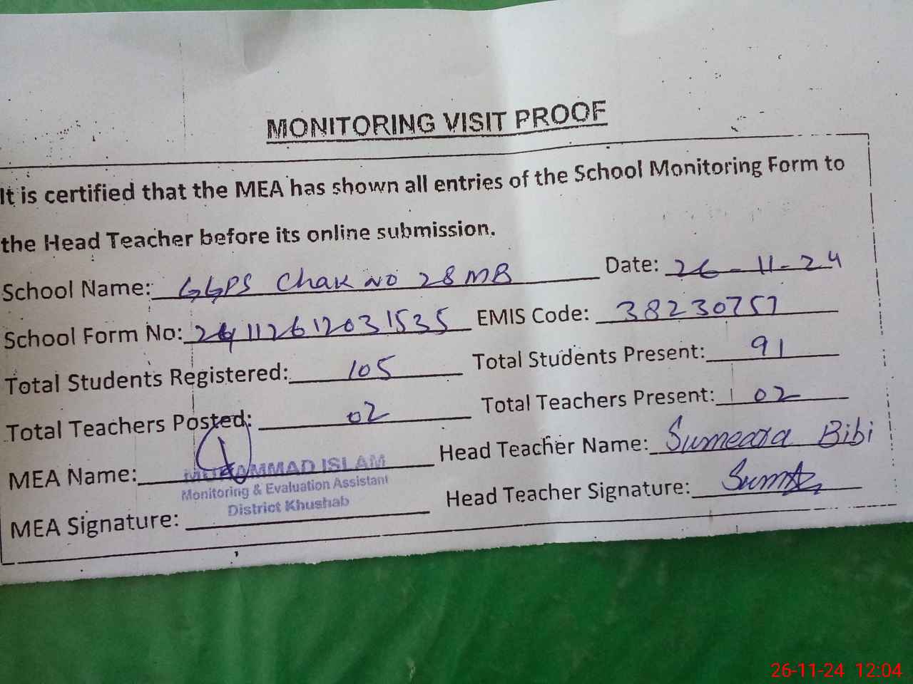 | Attendance Register | Head Teacher | MEA with School | Visit Proof |