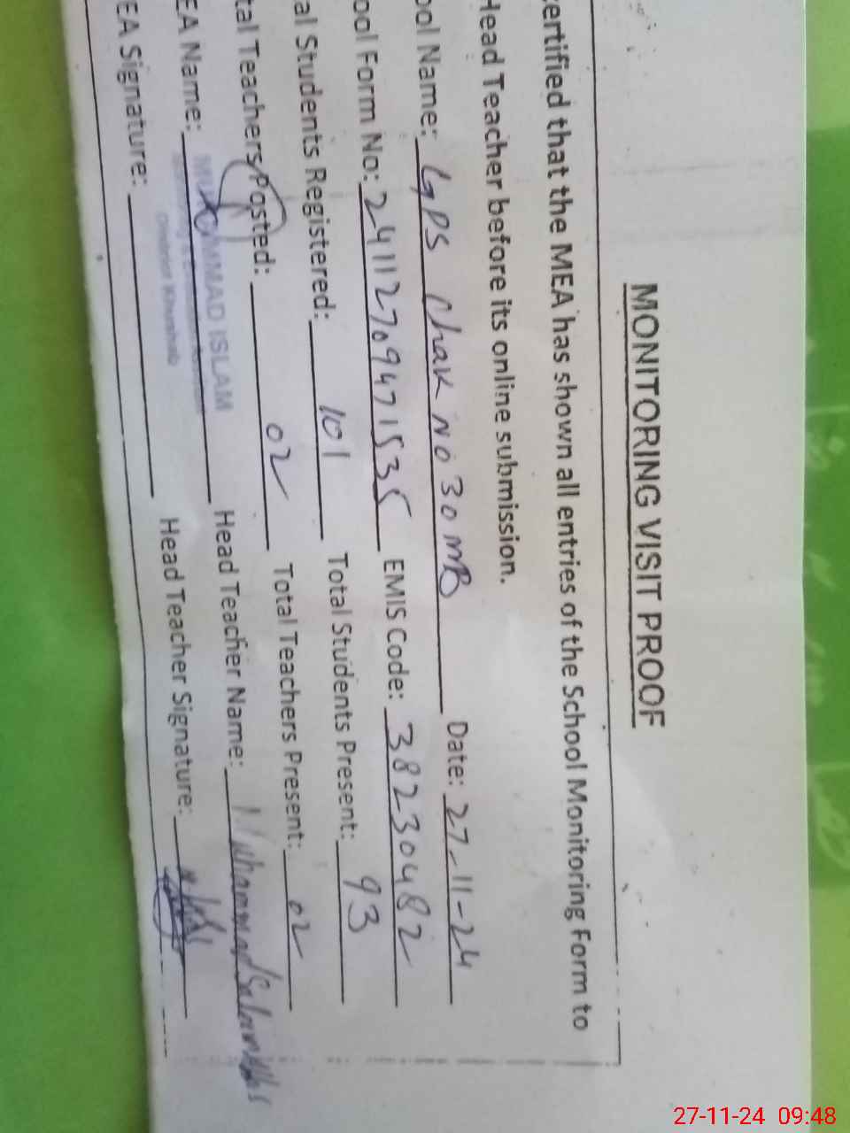 | Attendance Register | Head Teacher | MEA with School | Visit Proof |