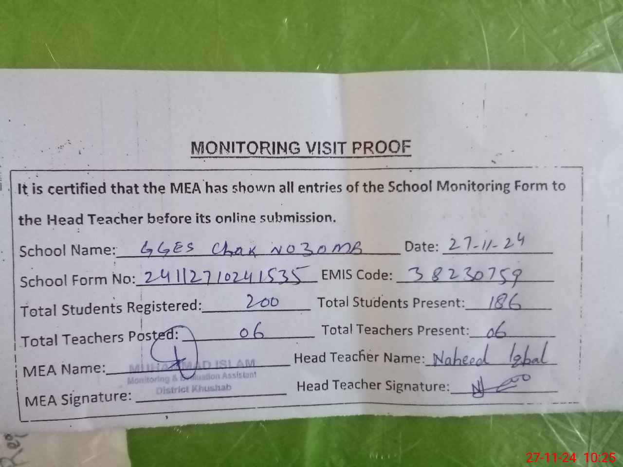| EMIS Code: 38230759 | Name of School: GGES CHAK NO 30 MB | |||