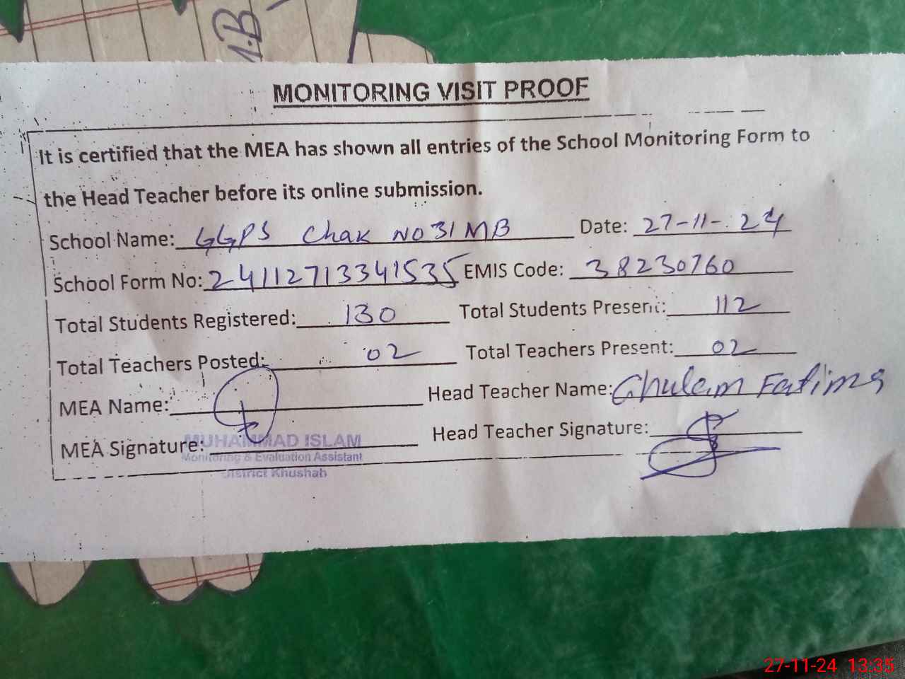 | EMIS Code: 38230760 | Name of School: GGPS CHAK NO 31 MB | |||