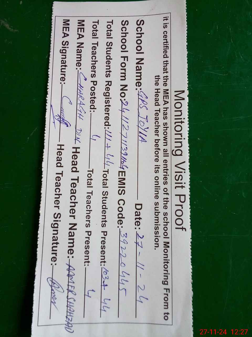 | Attendance Register | Head Teacher | MEA with School | Visit Proof |