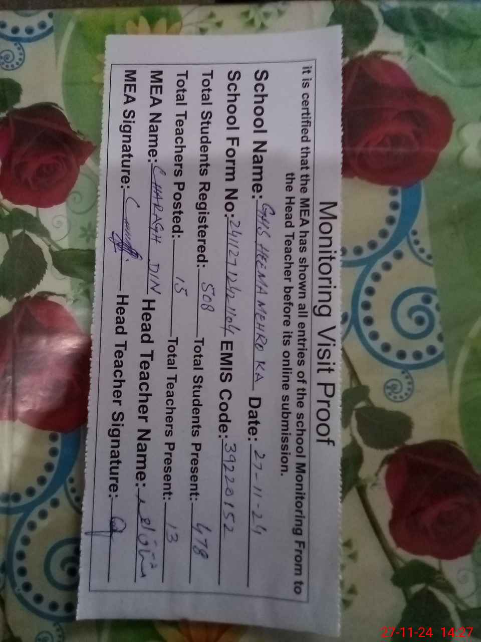 | Attendance Register | Head Teacher | MEA with School | Visit Proof |