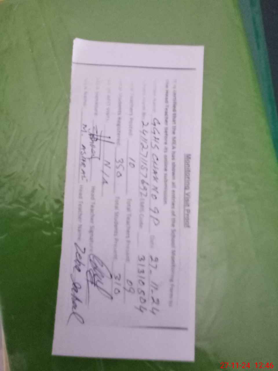 | Monitoring Date: 27-11-2024 | Start Time: 27-11-2024 11:57 AM | End Time: 27-11-2024 12:46 PM | Name of MEA: Mu**** As**** KP**** | |