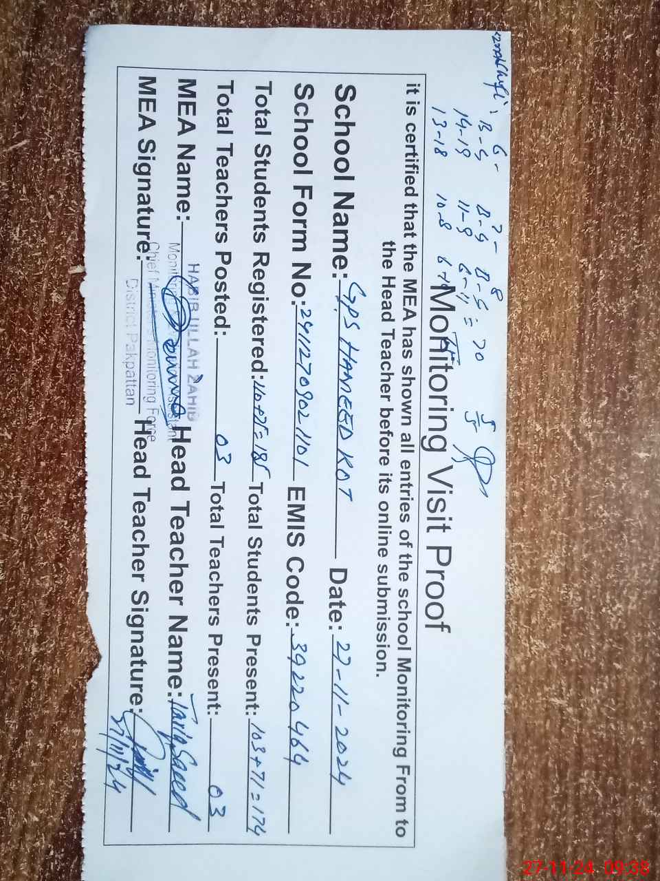| EMIS Code: 39220464 | Name of School: GPS HAMEED KOT (MEHMOOD KOT) | |||