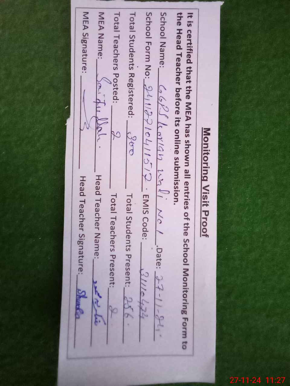 | Attendance Register | Head Teacher | MEA with School | Visit Proof |