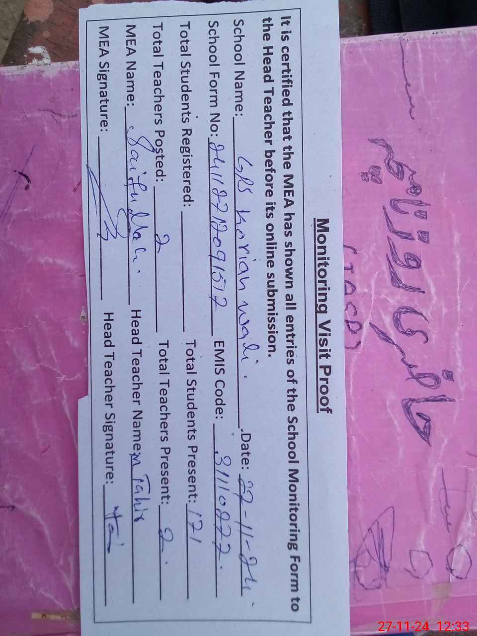 | EMIS Code: 31110277 | Name of School: GPS KORIAN WALI | |||