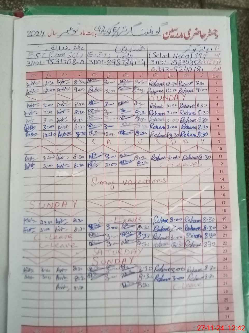 | 31**** | Sa**** Sa**** | 2 | 2 | 0 | 0 | 0 | 0 | 0 | 0 | 0 | 0 | 0 | Absent (Un-Authorized) |