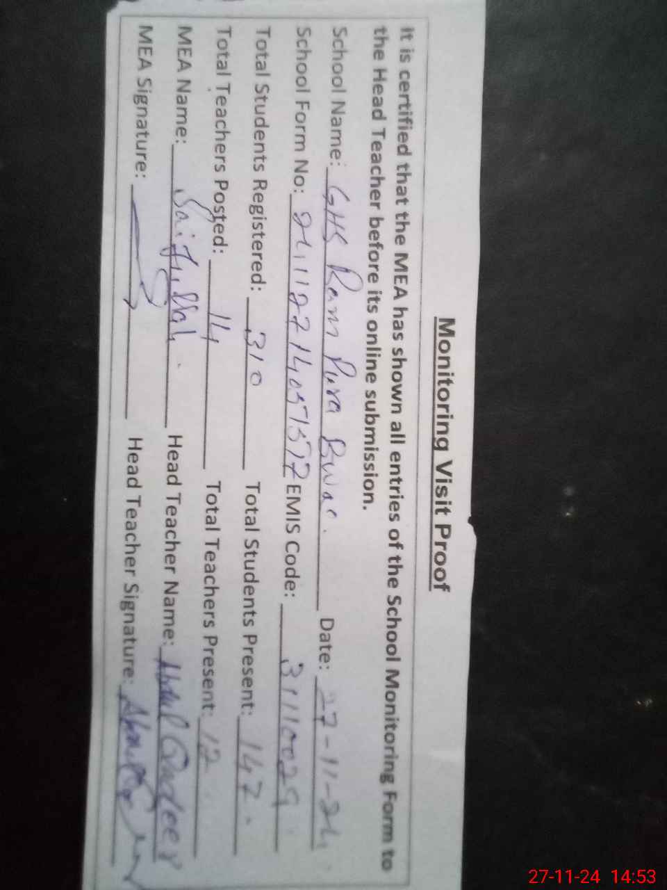 | EMIS Code: 31110029 | Name of School: GHS RAM PURA BAHAWAL NAGAR | |||