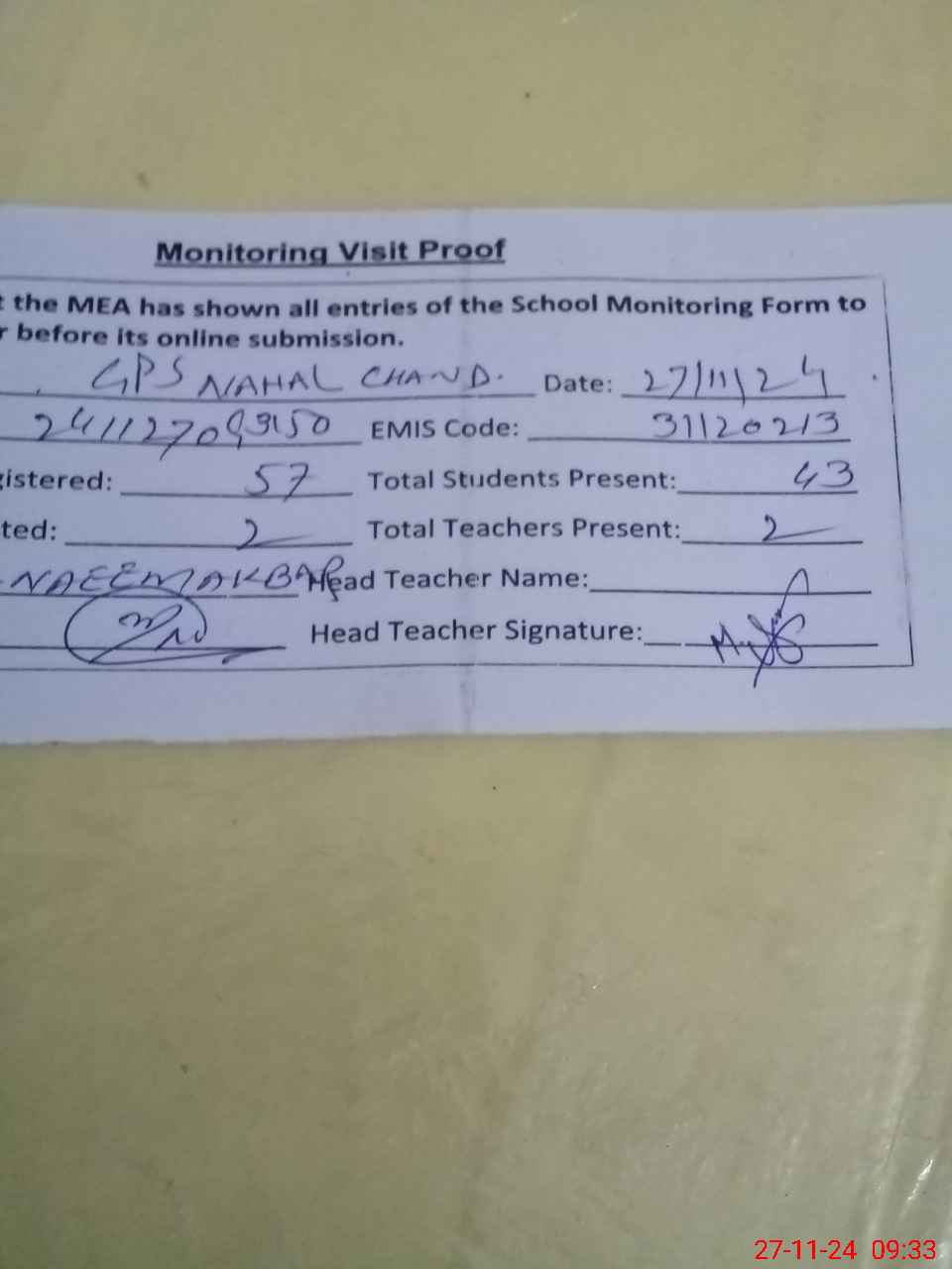 | EMIS Code: 31120213 | Name of School: GPS NAHAL CHAND | |||