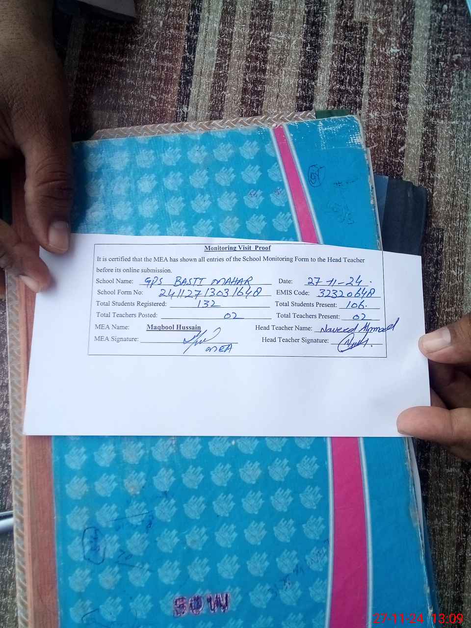 | Attendance Register | Head Teacher | MEA with School | Visit Proof |