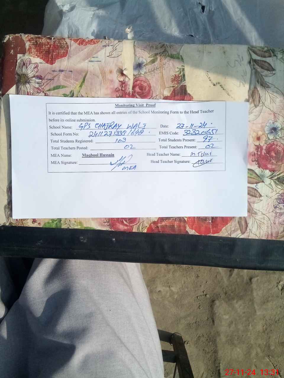 | EMIS Code: 32320651 | Name of School: GPS CHAJRAY WALI | |||