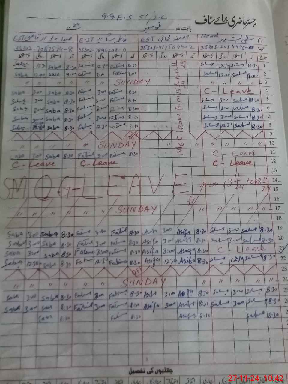 | CNIC | Full Name | Designation | R/C | Absence During Last Calender Month |