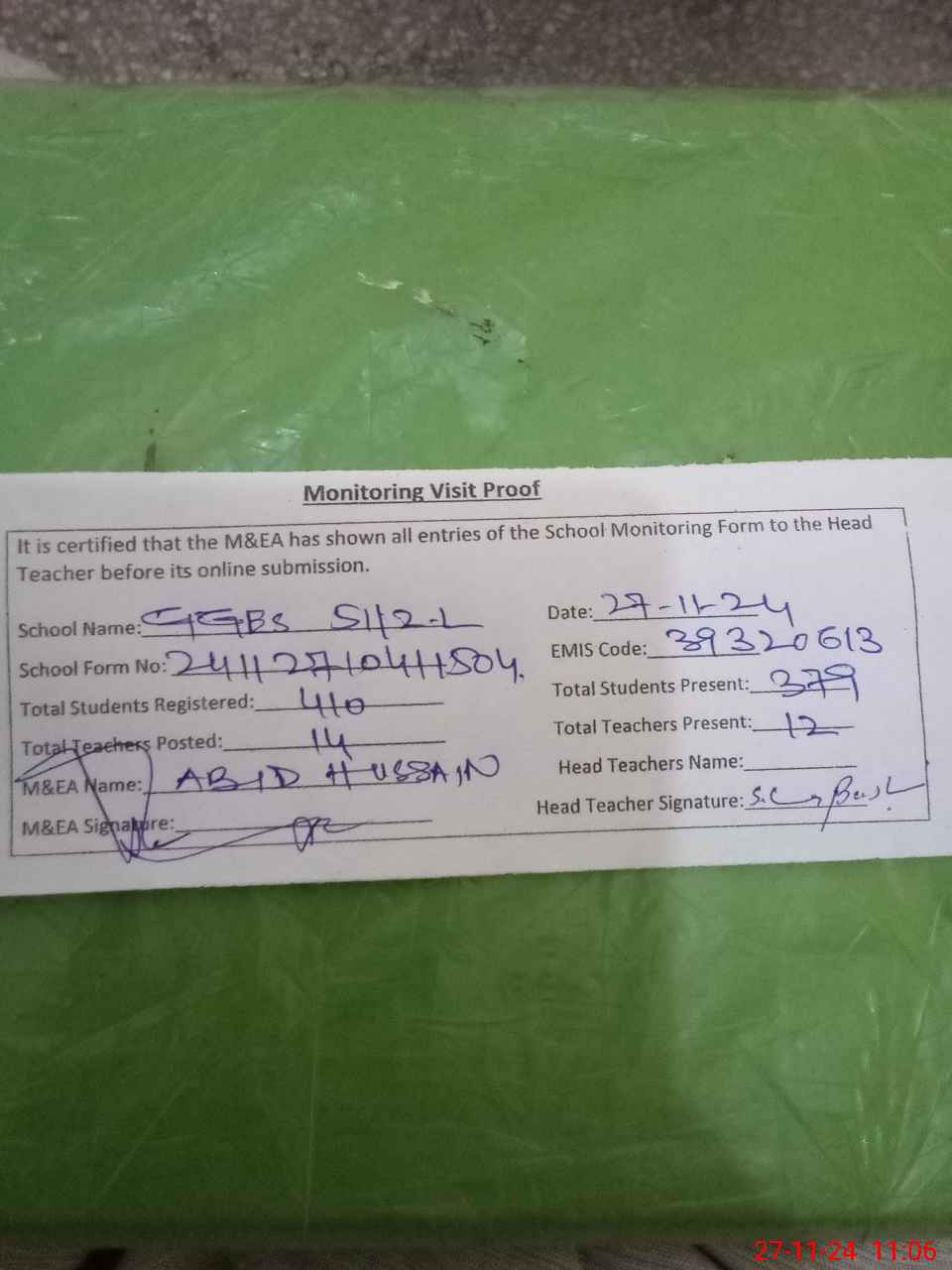| Attendance Register | Head Teacher | MEA with School | Visit Proof |