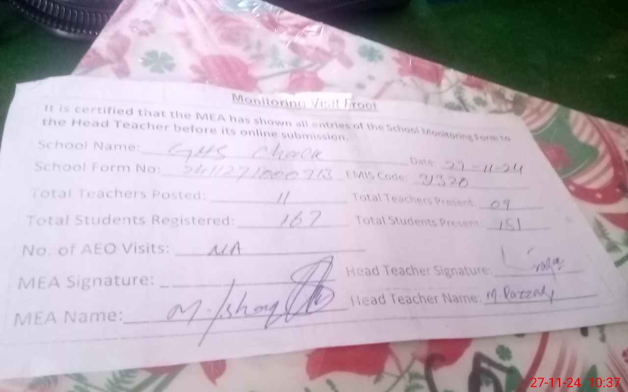 | Attendance Register | Head Teacher | MEA with School | Visit Proof |