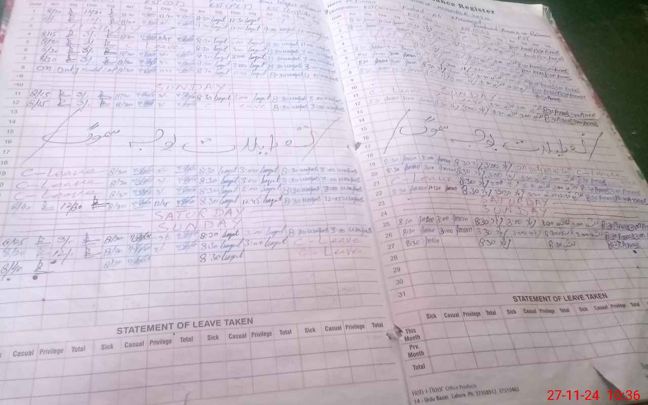 | CNIC | Full Name | Designation | R/C | Absence During Last Calender Month |