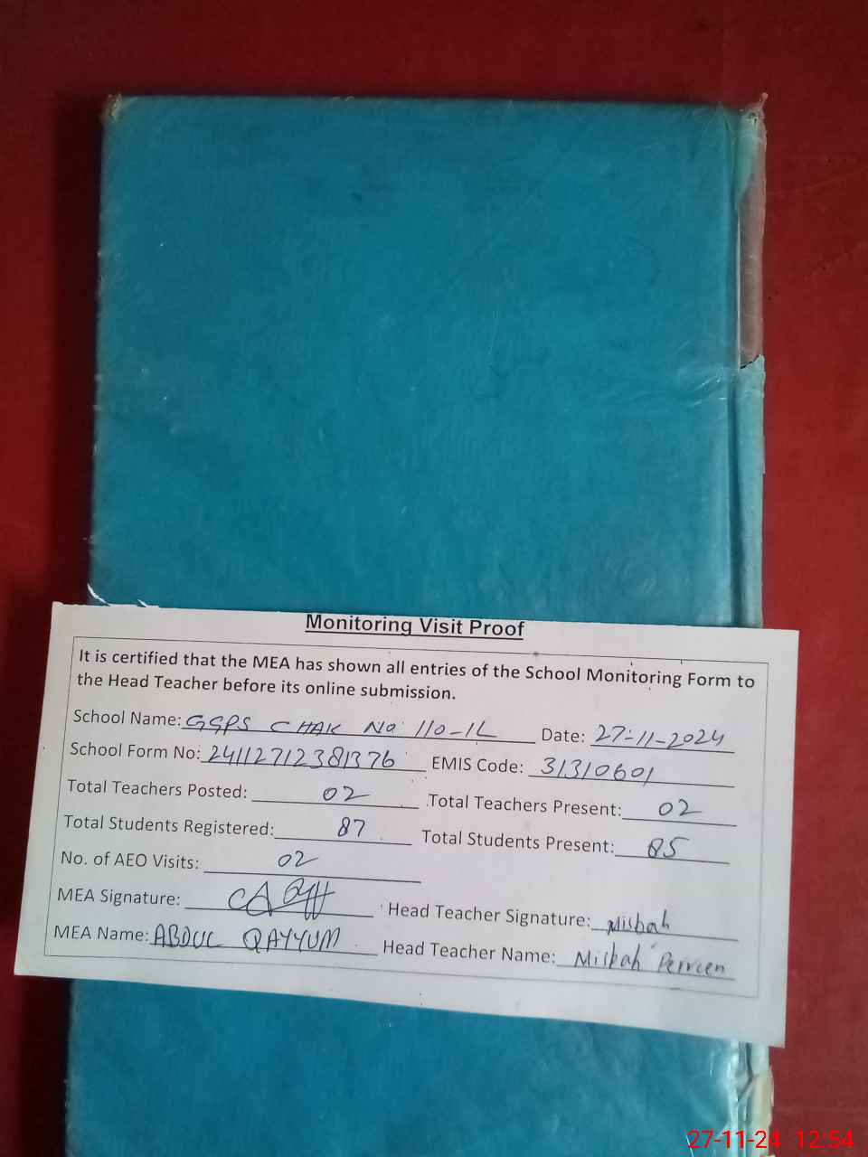 | Attendance Register | Head Teacher | MEA with School | Visit Proof |