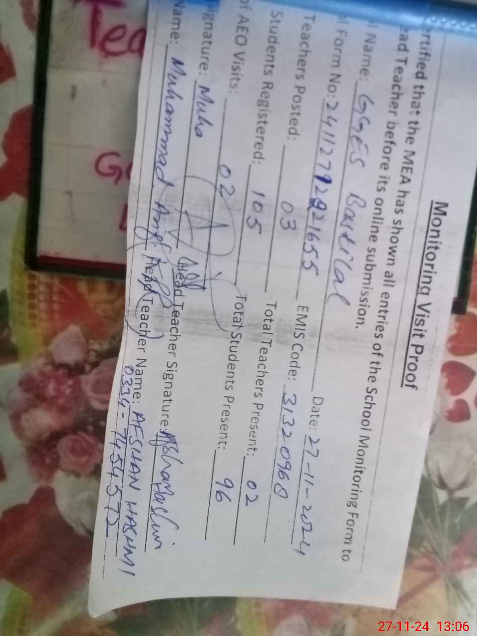 | Name: AF**** HA**** Designation: (School Headmaster's/Headmistress's) E.S.T. (Sc Math) Phone/Cell Number: 03**** |