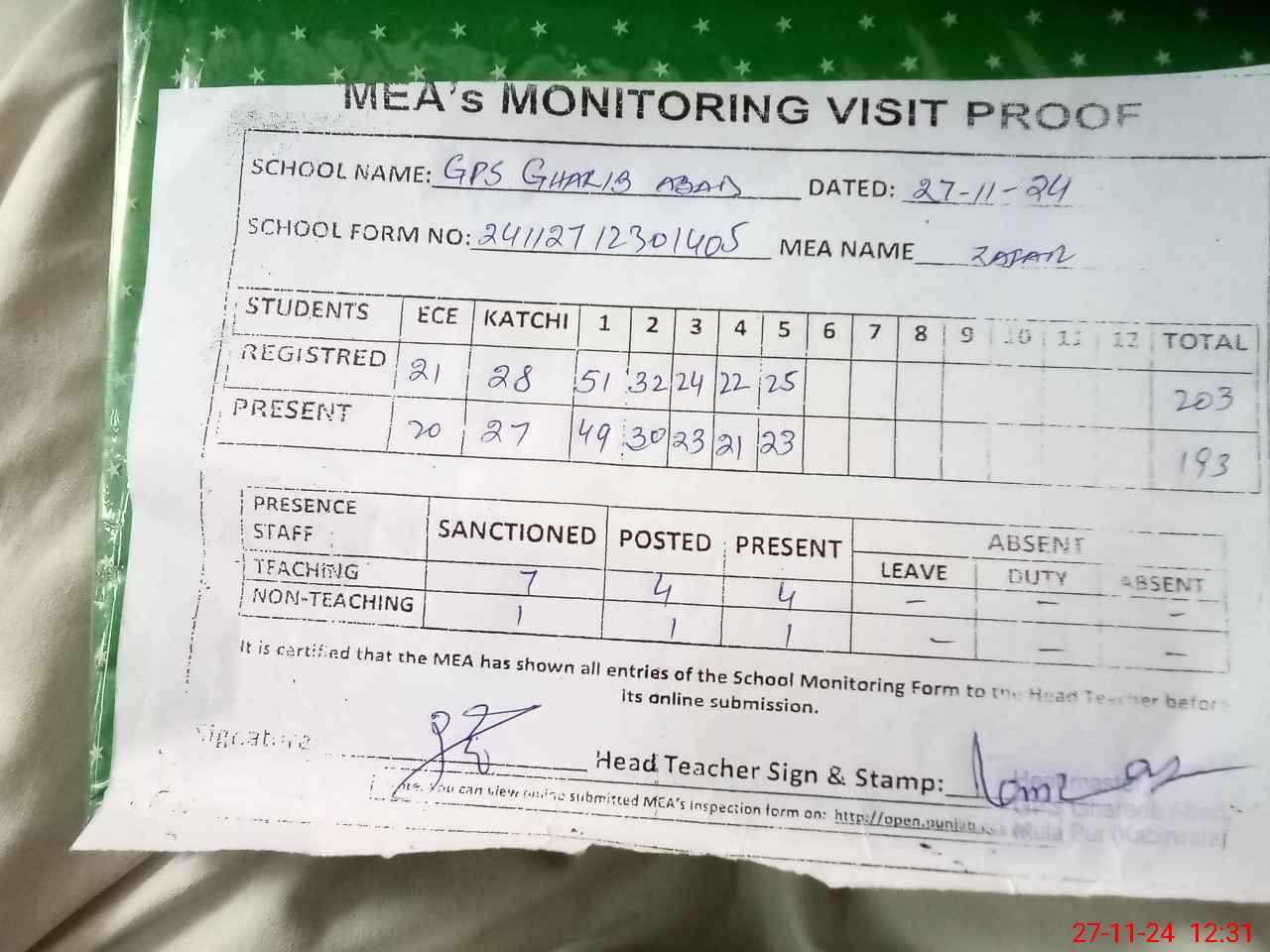 | Attendance Register | Head Teacher | MEA with School | Visit Proof |