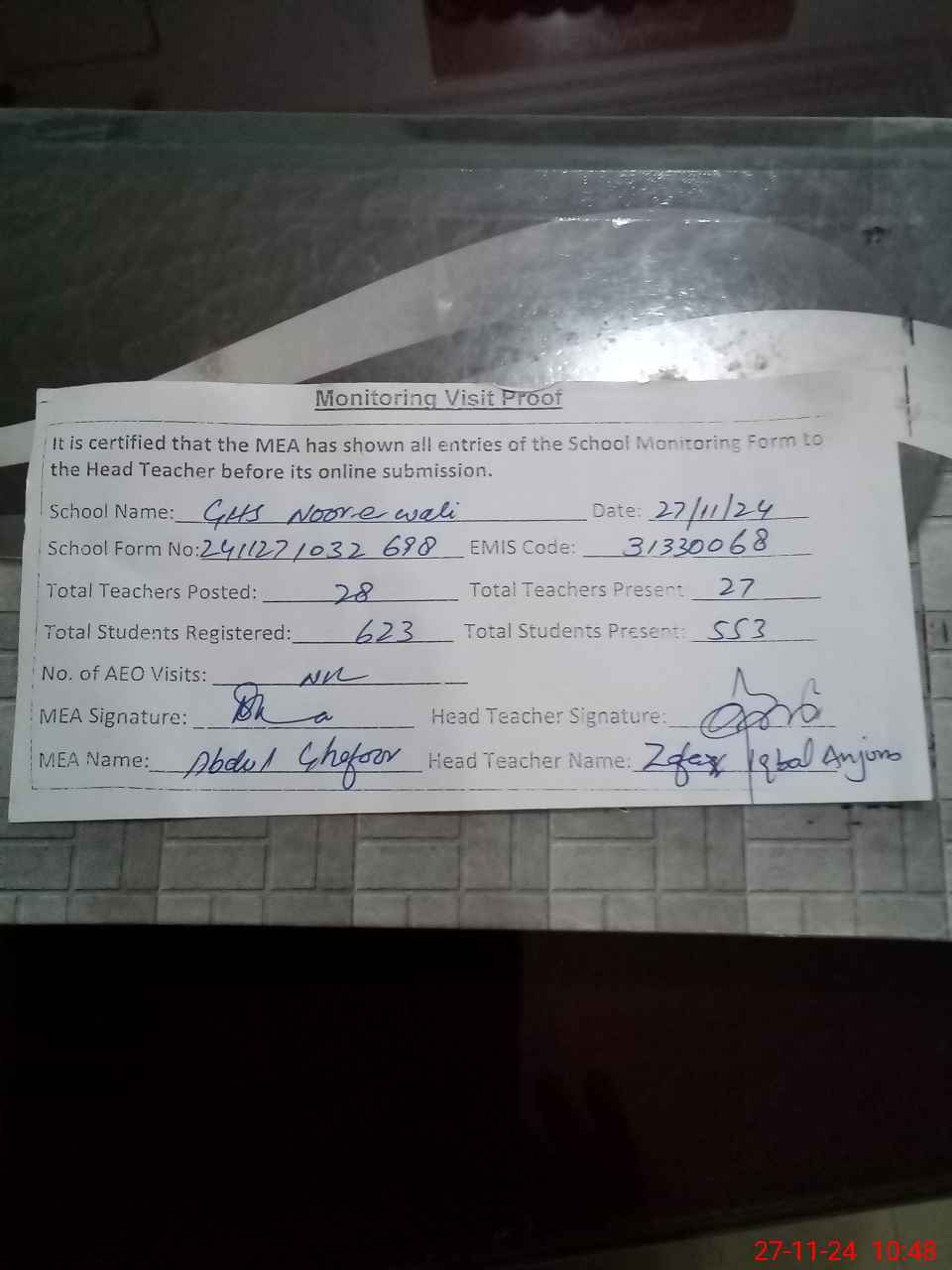 | Attendance Register | Head Teacher | MEA with School | Visit Proof |
