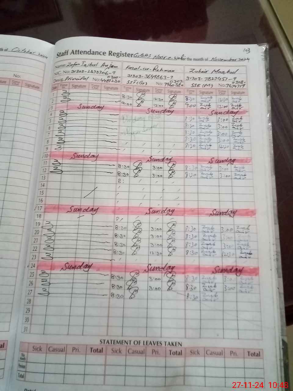 | CNIC | Full Name | Designation | R/C | Absence During Last Calender Month |