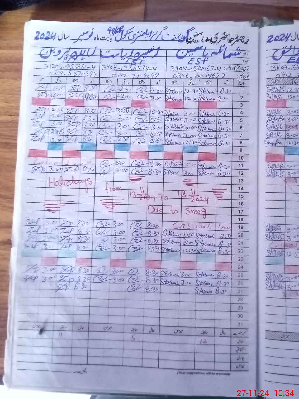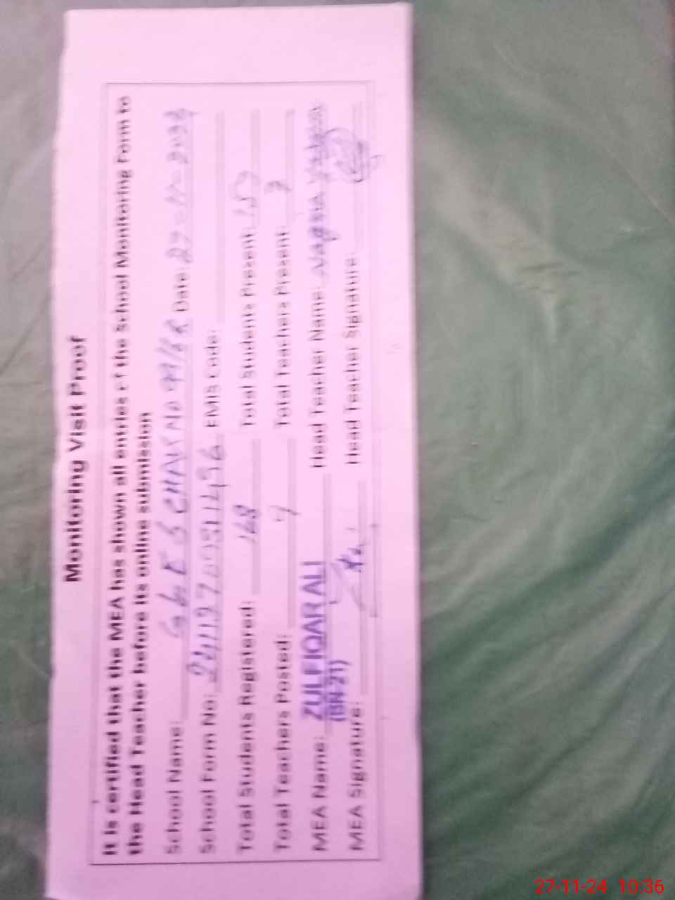 | Monitoring Date: 27-11-2024 | Start Time: 27-11-2024 09:51 AM | End Time: 27-11-2024 10:36 AM | Name of MEA: Zu**** Al**** BN**** | |