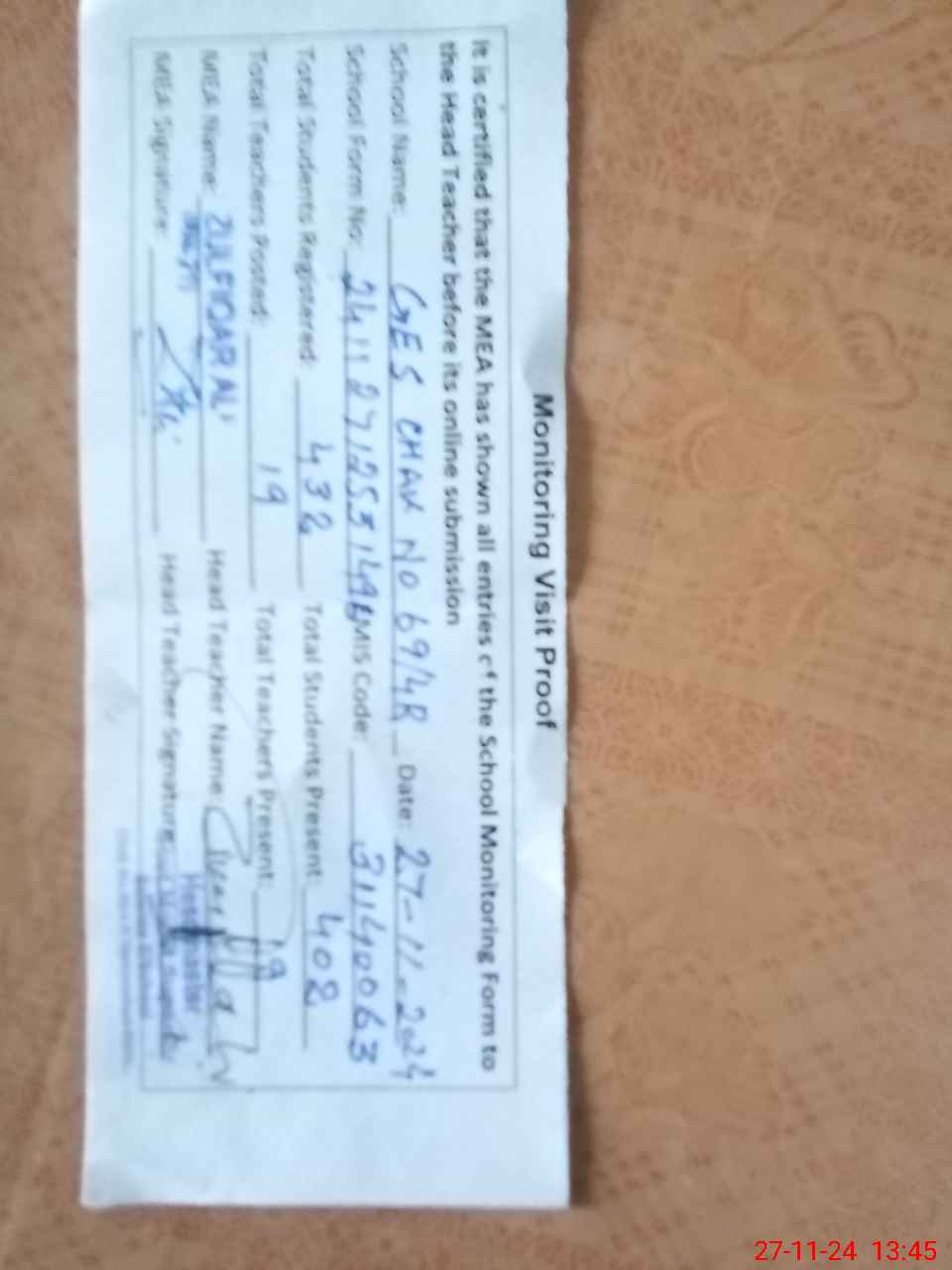 | Attendance Register | Head Teacher | MEA with School | Visit Proof |