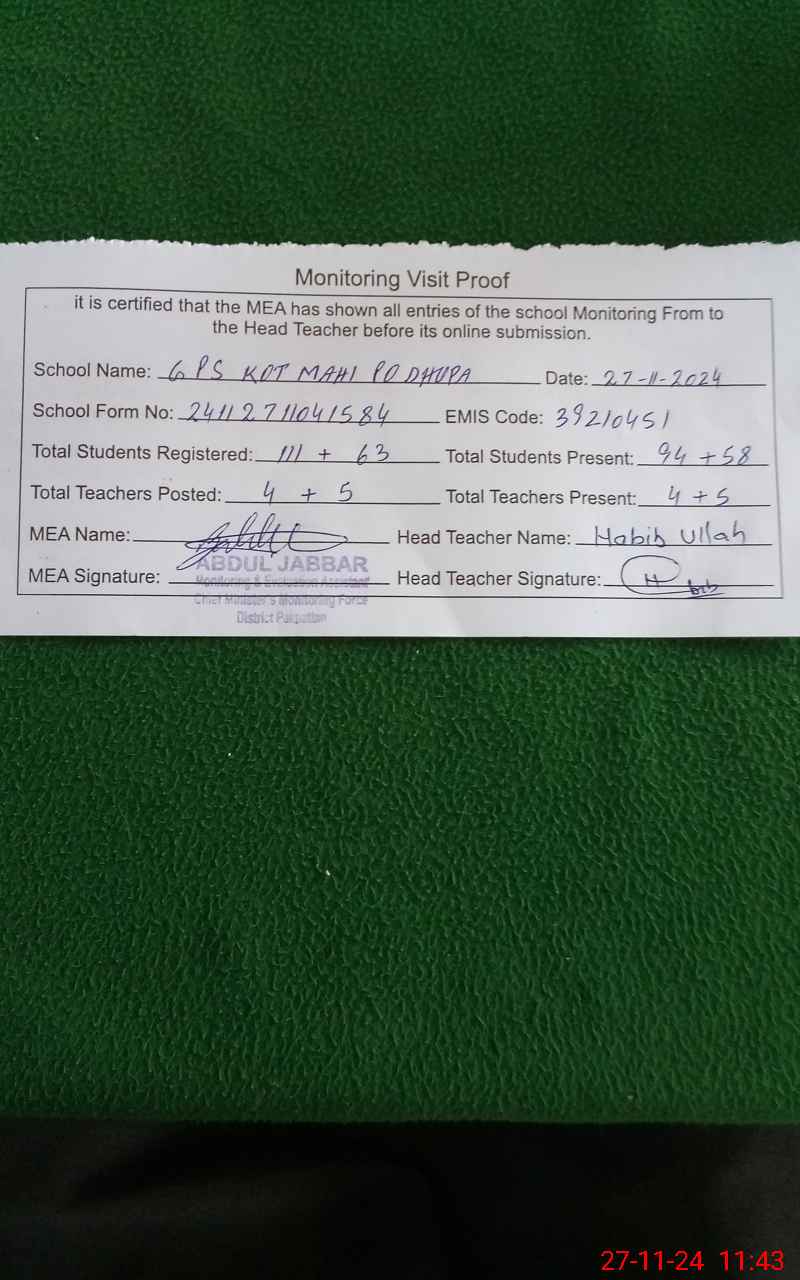 | EMIS Code: 39210451 | Name of School: GPS KOT MAHI P/O DHUPA | |||