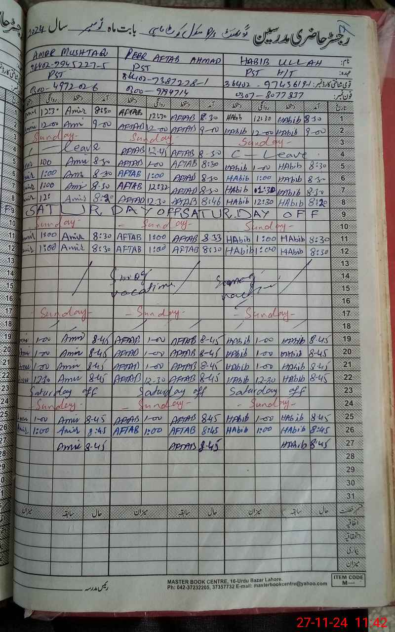 | CNIC | Full Name | Designation | R/C | Absence During Last Calender Month |
