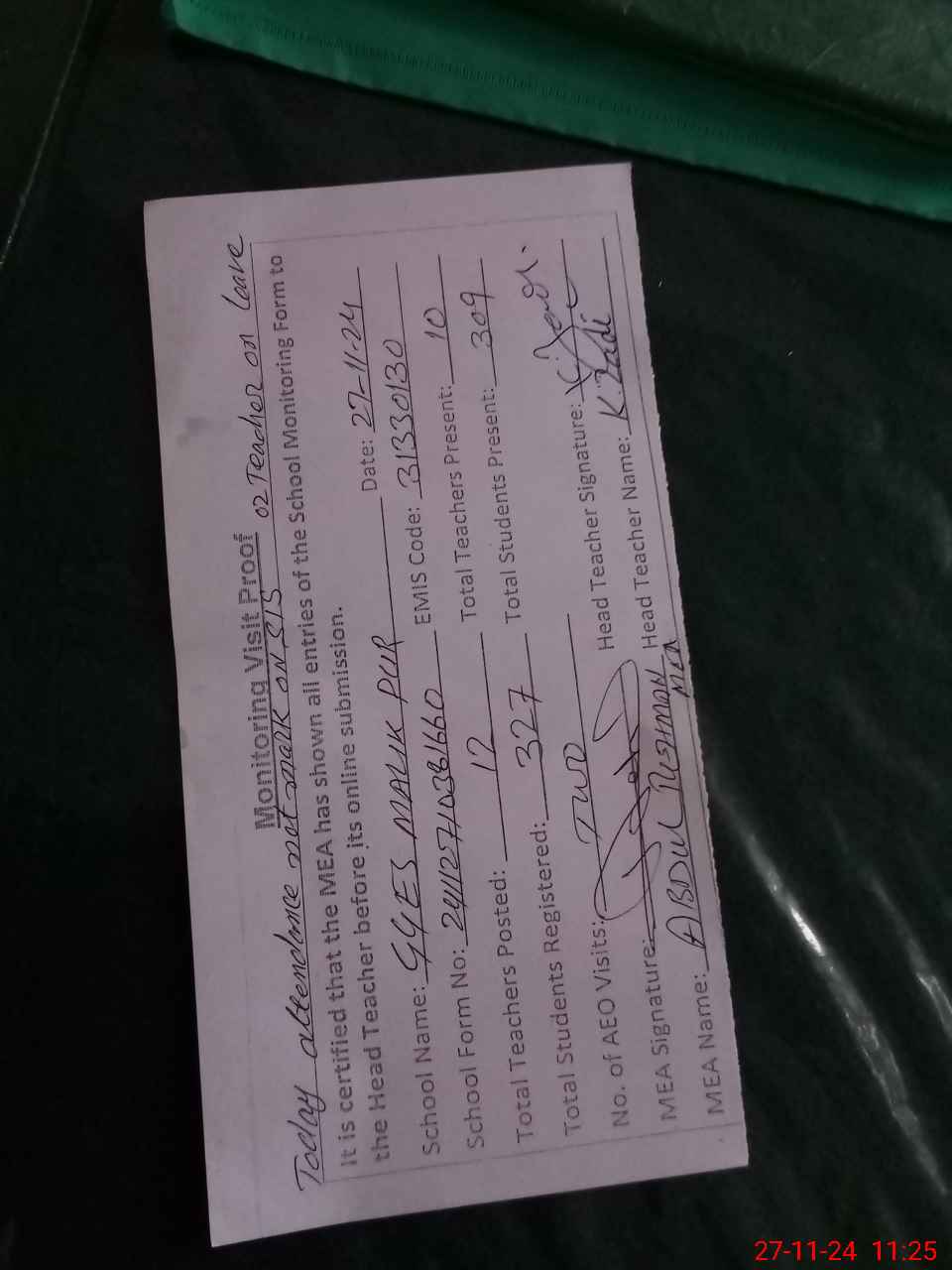 | Attendance Register | Head Teacher | MEA with School | Visit Proof |