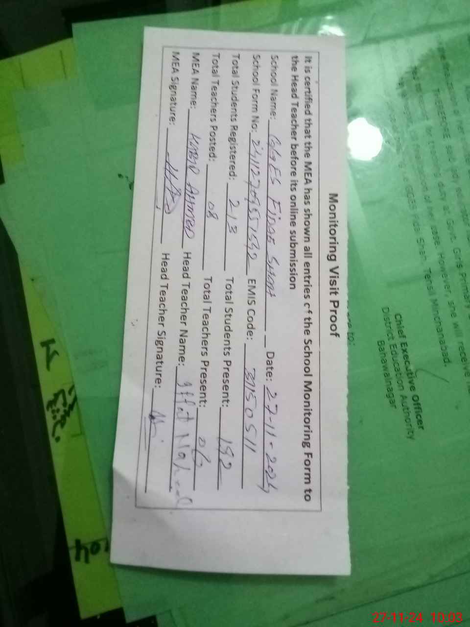 | Name: If**** Na**** Designation: (School Headmaster's/Headmistress's) SST Phone/Cell Number: 03**** |