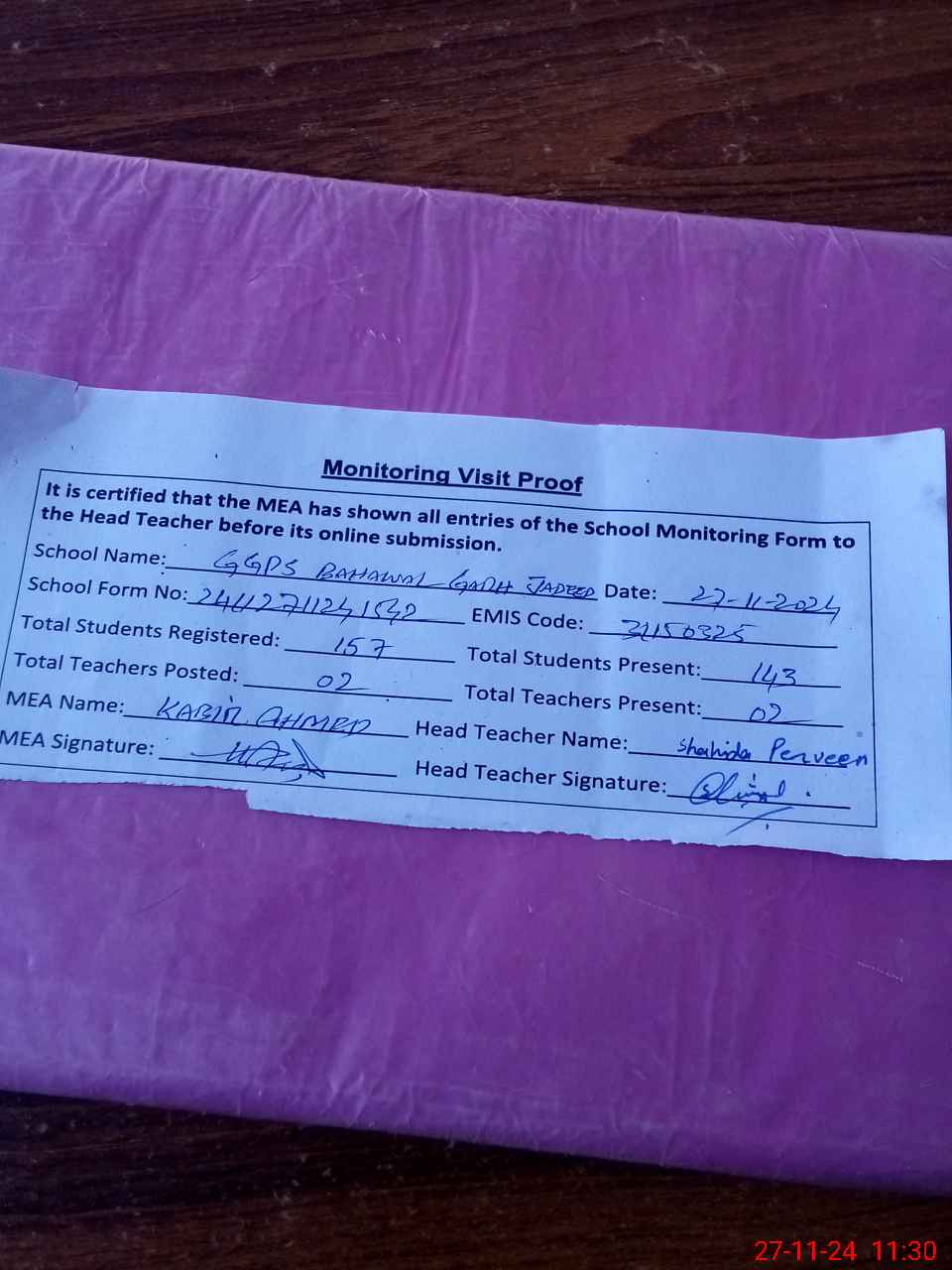 | Attendance Register | Head Teacher | MEA with School | Visit Proof |