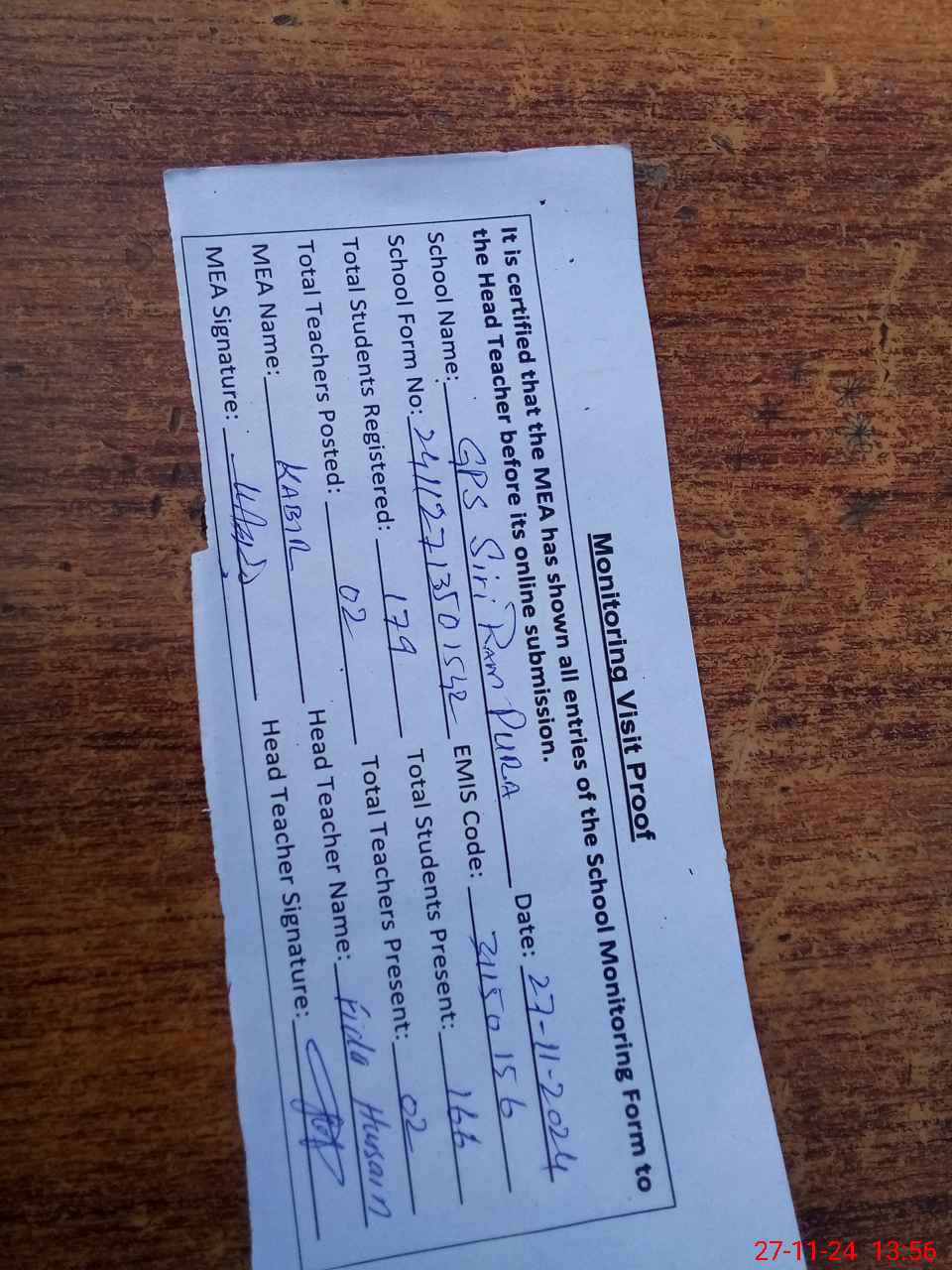 | Attendance Register | Head Teacher | MEA with School | Visit Proof |