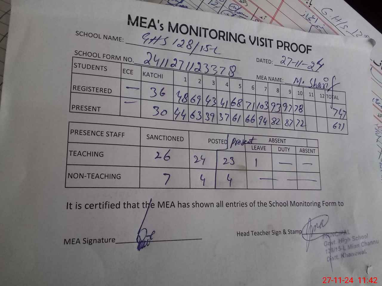 | Attendance Register | Head Teacher | MEA with School | Visit Proof |